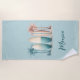Watercolored retro surfboards and palm trees in gree, yellow and orange. Sage green coloured background. Personalise and add your name.