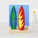 Happy Birthday card with cool design of two brightly coloured surfboards standing on a beach. These surfboards are retro classic style and reminiscent of a bright Summer, sunny day at the beach. A great design for lovers of the beach and of surfing.
