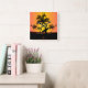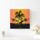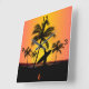 Surfer walking on beach with surfboard at sunset past tropical palm trees with glistening ocean in the background