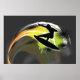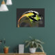 Surfer black figure & colourful wave custom poster, featuring a black figure of a surfer, colourful waves in green and orange and halftone pattern on grey/grey background.