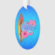 Surfer girl design with water splashes, retro style surfboard with Hawaiian Honu turtles, and pink hibiscus flowers.
