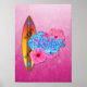 Surfer girl design with water splashes, retro style surfboard with Hawaiian Honu turtles, and pink hibiscus flowers.
