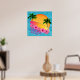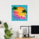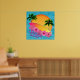 Surfer girl with surf board, palm trees, sunset, and hibiscus flowers.