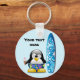 Cute penguin wearing swimwear and holding an icecream and a blue surfing board with flower pattern.
