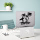 Surfing inspired large contoured sticker of a black silhouette of a surfer, carrying a surf board and palm trees. Black graphic text reads Surf's Up.