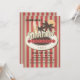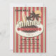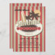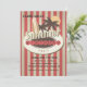 A centre medallion holds a surfboard, palm trees, and the sun. On a dotted banner, spell out birthday or any other occasion. The background has a muted red and sand bold stripe. A fun invitation for any age or gender.