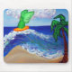 (The painting is of a green angel on an orange surfboard catching a wave. A sun glows in the background and palm tree gently sways on the beach. The wave is getting ready to crash on the beach smoothing the sandy surface. The green angel pays tribute to the Archangel Raphael whose colour is green and is known for bringing healing. The sun helps sustain life and through it plants such as palm trees strengthen and grow. The power of sun's energy is symbolised in the matched orange- yellow surfboard. The beach is clean and smooth. This painting was inspired by the "Wipe Out Cancer Angel". Instead of adding text of this painting, it was left open so you can your own wipe out, riding the wave, or other go with flow message to the beach, cloud, or sky.