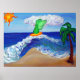The painting is of a green angel on an orange surfboard catching a wave. A sun glows in the background and palm tree gently sways on the beach. The wave is getting ready to crash on the beach smoothing the sandy surface. The green angel pays tribute to the Archangel Raphael whose colour is green and is known for bringing healing. The sun helps sustain life and through it plants such as palm trees strengthen and grow. The power of sun's energy is symbolised in the matched orange- yellow surfboard. The beach is clean and smooth.