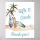 Cute surfing-themed baby shower gift drop off sign featuring a watercolor illustration of tropical beach scene with palm trees, sandy shores, starfish and vibrant teal and brown surfboards, and "Gifts & Cards" and "Thank You!" in a fun blue retro script.