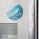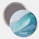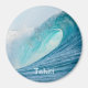 Round magnet with a great surfing barrel wave breaking into a big splash and turquoise colours in the best place to surf, the Pacific Ocean with the text: 'Tahiti'.