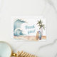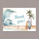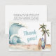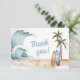 Cute surfing-themed thank you card for your baby shower guests featuring a watercolor illustration of a tropical beach scene with breaking waves, palm trees, sandy shores, starfish and surfboards, and "Thank you!" showcased in a fun retro blue script. On the back, personalise your thank you message or leave blank for a handwritten note.