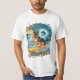A smart, cute, and funny German shepherd rides on top of a surfboard on a huge wave in a tropical island setting.