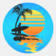 Surfing art of a surfer standing on shore and a sunrise over the water.