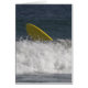 An image of a yellow surf board poking out of the waves after a wipeout.