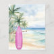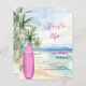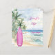 An invitation for a beach birthday party for a girl. A watercolored sandy beach, ocean waves and palm trees as background, and a pink surfboard on the beach.