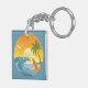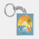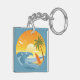 Round design of a beach scene with a small island sporting a palm tree and surf board rising from the sand, surrounded by blue waves under the setting sun. This keychain is fully customisable and ready to be personalised.