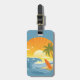 Round design of a beach scene with a small island sporting a palm tree and surf board rising from the sand, surrounded by blue waves under the setting sun.  This luggage tag is fully customisable and ready to be personalised.