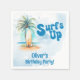 Surf's up summer birthday party napkins. Blue watercolor wash surf board and beach Aloha!