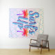 Summery surf's up sunset palm trees wall tapestry with a quatrefoils background.