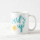 Surf's up! Celebrate summer with our cute quote mug featuring "surf's up" in vibrant turquoise teal handwritten style typography with a bright yellow sun illustration.