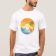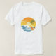 Round design of a beach scene with a small island sporting a palm tree and surf board rising from the sand, surrounded by blue waves under the setting sun. This t-shirt is fully customisable.