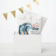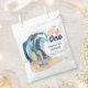 Surf theme baby's 1st birthday favour bags feature a watercolor big wave, surfboards and starfish on the beach with "The Big One" typography in retro cool lettering. The tropical colours (coral, turquoise and navy blue) work great for a boy or girl baby. Art by KL Stock.
