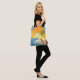 Round design of a beach scene with a small island sporting a palm tree and surf board rising from the sand, surrounded by blue waves under the setting sun. This tote bag is fully customisable.