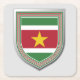 The national flag of Suriname is infused into a grey shield shape. The shield that encapsulates the flag, is surrounded by outlines which are in the flag colours.