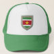 The national flag of Suriname is infused into a grey shield shape. The shield that encapsulates the flag, is surrounded by outlines which are in the flag colours.