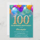Surprise 100th Birthday Teal and Gold Colourful Balloons and Confetti Invitation. For further customisation, please click the "Customise it" button and use our design tool to modify this template.