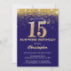 Surprise 15th Birthday Navy Blue and Gold Glitter Confetti Birthday Invitation. For further customisation, please click the "Customise it" button and use our design tool to modify this template.