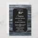 A rustic silver-bordered blue and grey barn wood surprise 50th birthday dinner invitation with the white text highlighted on a black background.