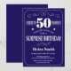 Surprise 50th Birthday Invitation Navy Blue and White Typography. Navy Blue Background. Adult Birthday. Male Men or Women Birthday. Kids Boy or Girl Lady Teen Teenage Bday Invite. 13th 15th 16th 18th 20th 21st 30th 40th 50th 60th 70th 80th 90th 100th. Any Age. For further customisation, please click the "Customise it" button and use our design tool to modify this template.