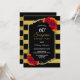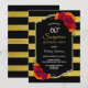 Black and gold striped surprise 60th birthday party invitation featuring elegant red and orange floral displays. Text is fully customisable to enable you to include all of your own information for your birthday celebration. (NB: Faux glitter has been featured on this invitation.)