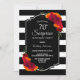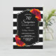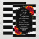 Black and white striped surprise 70th birthday party invitation featuring elegant red and orange floral displays. Text is fully customisable to enable you to include all of your own information for your birthday celebration.