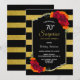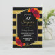 Black and gold striped surprise 70th birthday dinner party invitation featuring elegant red and orange floral displays. Text is fully customisable to enable you to include all of your own information for your birthday celebration. (NB: Faux glitter has been featured on this invitation.)