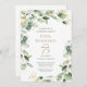 This exquisite, watercolor eucalyptus with gold leaf embellishments and gold splattered dots surprise 75th birthday party invitation with card request is perfect for celebrating your wife, mum, sister, aunt, friend, grandmother. It's soft flowy design is modern yet traditional. Select Personalise this template to make it uniquely your own. In seconds you will see your stunning 75th birthday party invitations.