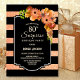 Black and coral faux glitter striped floral surprise 80th birthday party invitation.