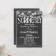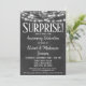 A fun black and white chalkboard surprise anniversary party invitation with glowing lights at the top.
