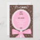 This cute surprise baby shower invitation features the words "It's a Surprise" at the very top on a brown background with pink confetti. The focal point of the invitation is a baby rattle where the baby shower invitation details appear along with "SHHH!" A pretty bow is also featured at the bottom of the rattle. A great invitation to a surprise baby shower for the lady expecting a baby girl. Copyright henishouseofpaper