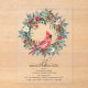 An elegant red cardinal nestled in a winter greenery wreath invites guests to your winter or Christmas birthday party. The watercolor design features a beautiful cardinal and a pine wreath decorated with red flowers and berries along with pine cones.