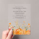 Acrylic invitations are the hottest invitation trend this year. Fall pumpkins are nestled in delicate golden yellow and orange wildflowers to create an elegant aesthetic. All of the text is editable so you can easily craft your own special mood.