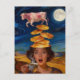 A surreal surprised woman with pancakes popping from her head as she holds her steaming hot coffee cup and a pink cow jumping over them all