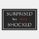 Display "Surprised but never Shocked" phrase on any flat surface like your binders or laptop. Black background with white and red lettering.