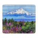 The artist's imaginative brushwork and vivid colours transport viewers to an enchanting version of the Alaskan wilderness featuring ice mountain with forest on blue sky background.