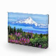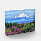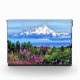 The artist's imaginative brushwork and vivid colours transport viewers to an enchanting version of the Alaskan wilderness featuring ice mountain with forest on blue sky background.
