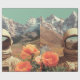 An astronaut stands in a vibrant field of flowers with snow-capped mountains in the background. The reflective visor shows a mesmerising blend of landscape and distant horizons.