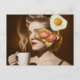 A woman holds a coffee mug and a breakfast of avocado and tomato toast and a fried egg float in the air surreal art