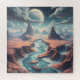 A beautiful surreal landscape with a large full moon rising over a pretty blue river. Ai art depicting a beautiful otherworldly landscape with a dreamlike quality.