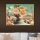 The image features a woman's face with flowers covering her eyes, set against a surreal landscape. A peach-coloured gerbera daisy covers one eye, while a yellow rose covers the other. Various other flowers and leaves are collaged around her head. The background shows a field of flowers leading to mountains under a teal sky with clouds. The mix of natural elements creates a surreal and dreamy atmosphere.